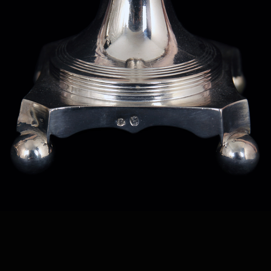 Par de castiçais em prata portuguesa, século XIX, contraste municipal de Lisboa, vulgarmente, conhecidos como Lisboa Coroa, marcados “cabeça de velho”, com marca legível de ourives.