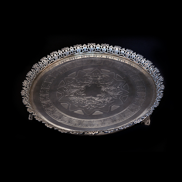 Salva de gradinha com três pés, gradinha relevada, fundo gravado e guilhochado “Flores” marca de ensaiador do Porto (1877-1881), marca de ourives de Cosme Teixeira (1877-1902).